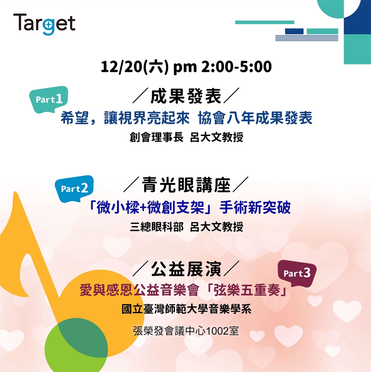 ![]() 2023/12/16 2023年最終場 【青光眼講座 & 弦樂四重奏】花絮2024/1/6 2023年歲末,大家辛苦一整年,是否身心安好呢?年終加辦這場講座及音樂盛宴,由本協會與中華民國愛盲協會共同舉辦。 | |