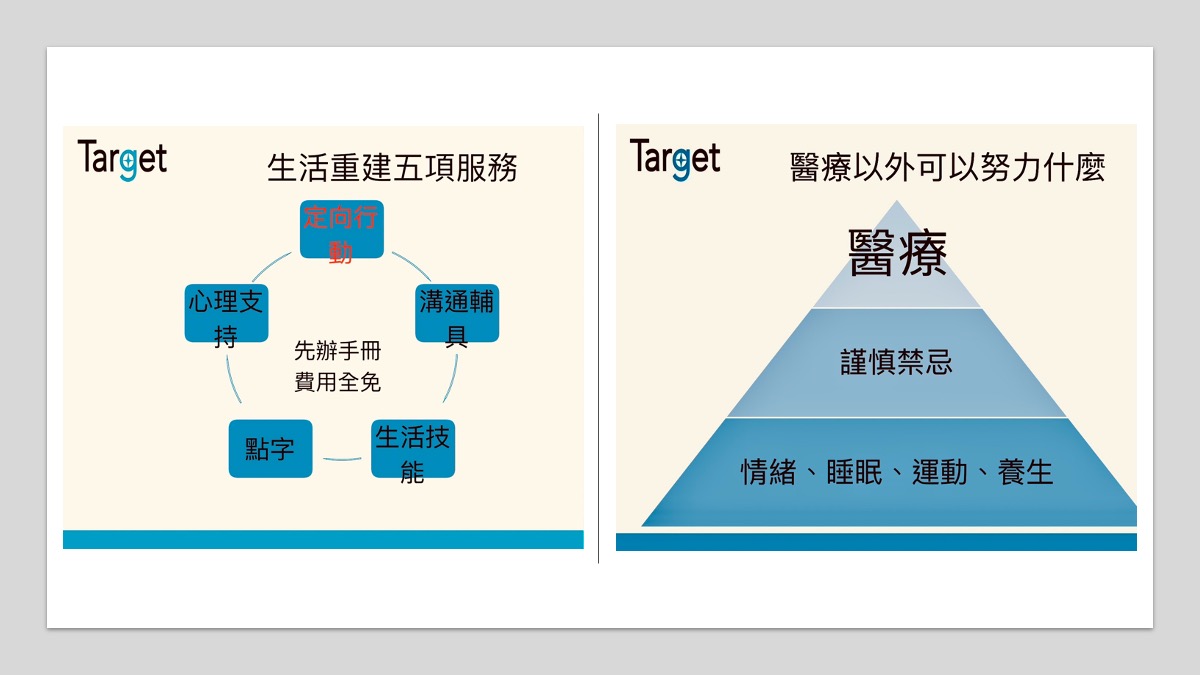 重建支持圈,包括病友陪伴或專業心理師輔導,以及生活與職能的重建。