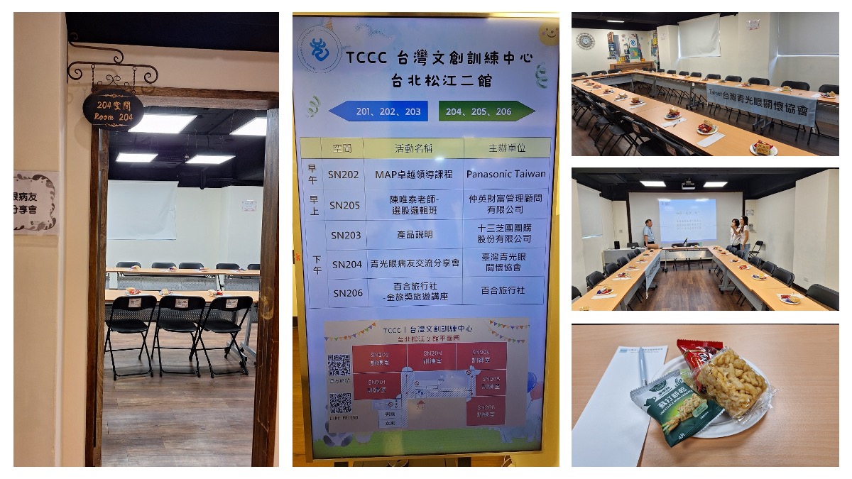 台灣文創訓練中心SN204教室,志工在座位前各備小點心及紙筆,輕音樂環繞會場,因為空間小,入內立刻拉近彼此距離。