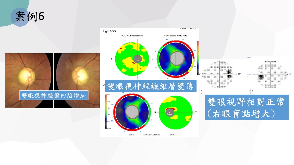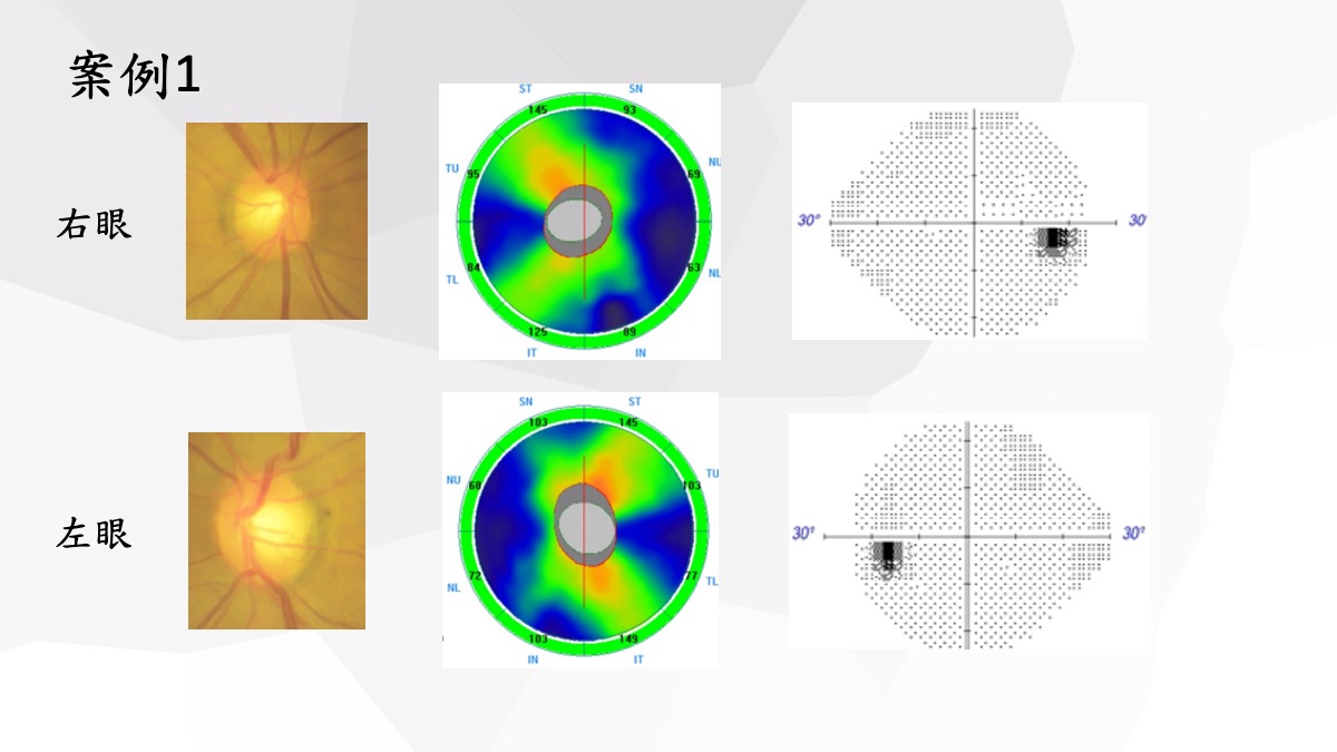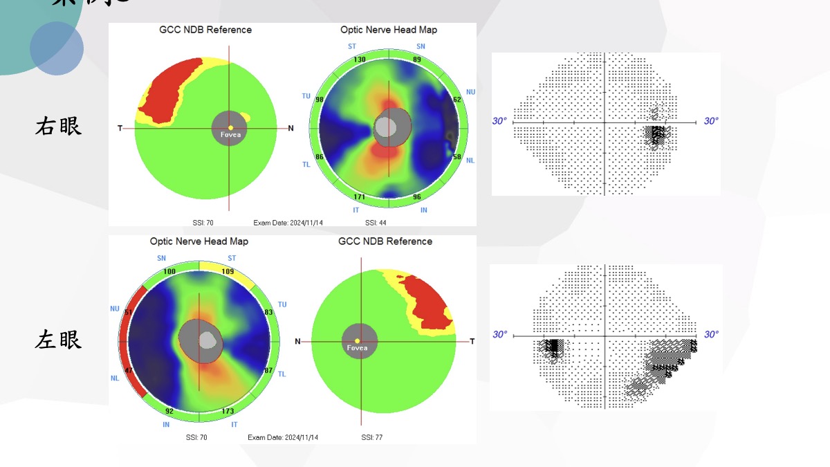首先,眼底照相發現雙眼視神經盤像傾斜、凹陷較大,視神經有點像橢圓。OCT顯示雙眼下方視神經纖維層變薄、神經節細胞減少;合併視野報告判讀雙眼上方視野部分缺損。