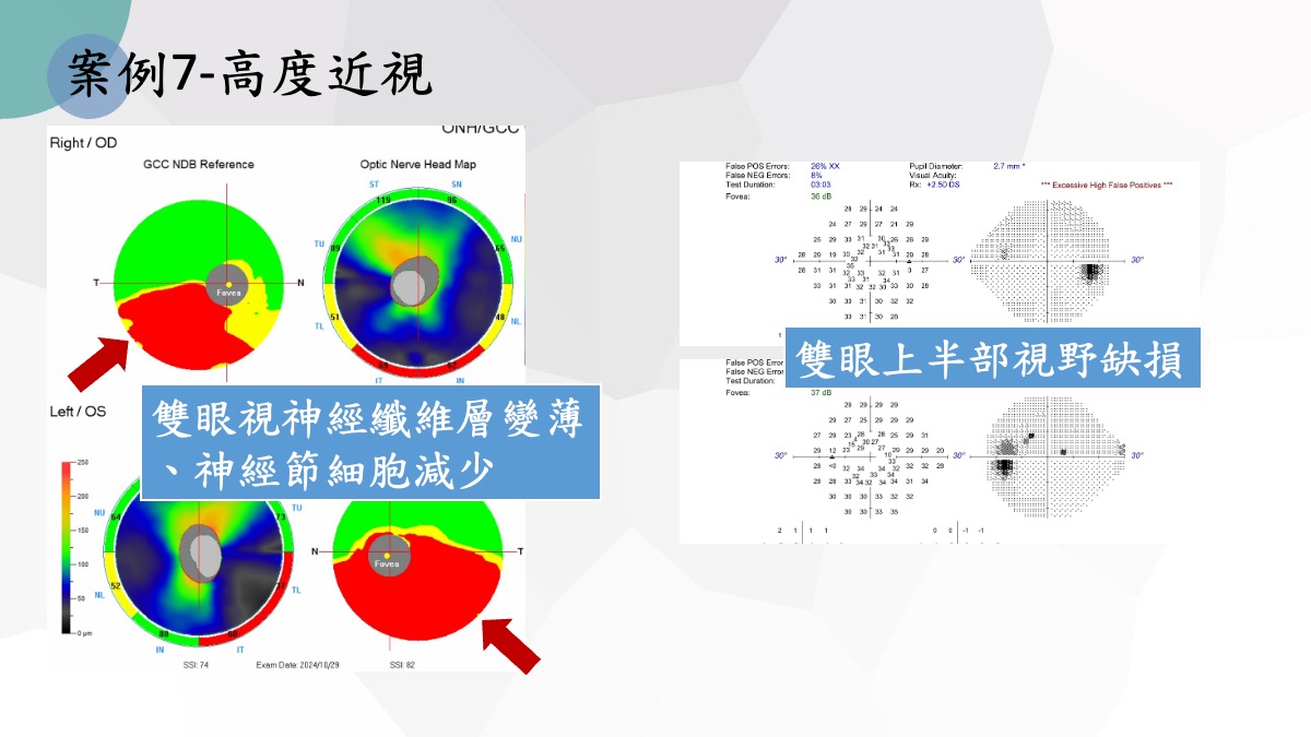 但是這確定是青光眼造成的缺損嗎?不一定,高度近視確實會影響青光眼的判讀,因此我認為還在疑似階段,可以繼續追蹤觀察;如果眼壓有高,也可以預防性投藥治療。
