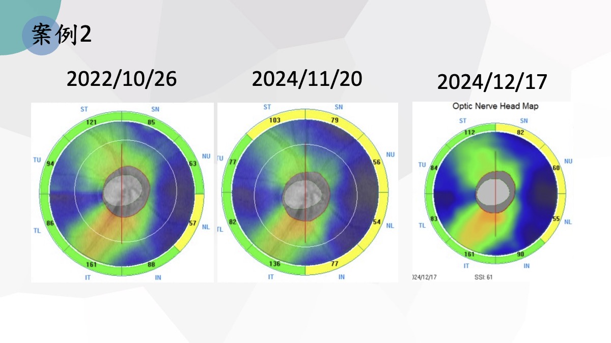 患者體檢發現兩年內視神經圖,從大部分綠轉大部分黃,過一個月回診再一次檢測後正常。一次不好不代表之後都是不好,有時產生的誤差在於眼睛中心點沒有對準,機器沒有抓到相同位置的關係。