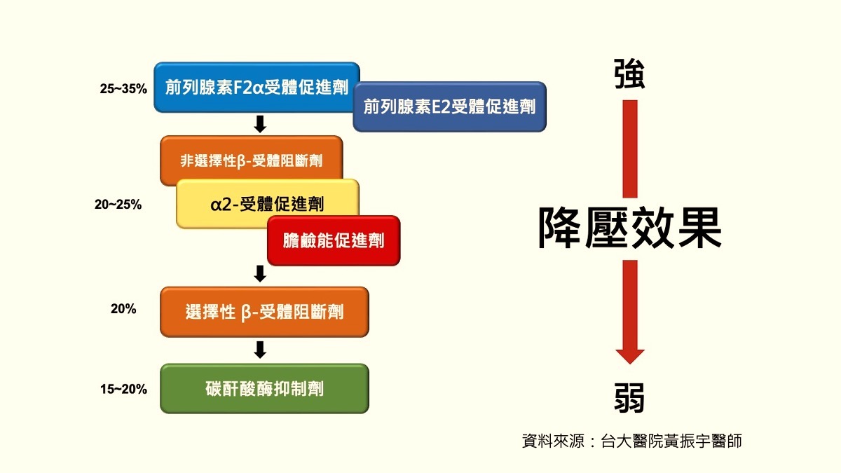 •夜間降壓效果較佳的藥物:前列腺素F2α受體促進劑、前列腺素E2受體促進劑、α2-受體促進劑、碳酐酸酶抑制劑。