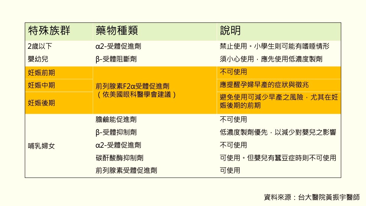 •前列腺素F2α受體促進劑或前列腺素E2受體促進劑,由於是發炎性產物,可能引起黃斑部水腫;尤其是後者,於白內障術後不可繼續使用。