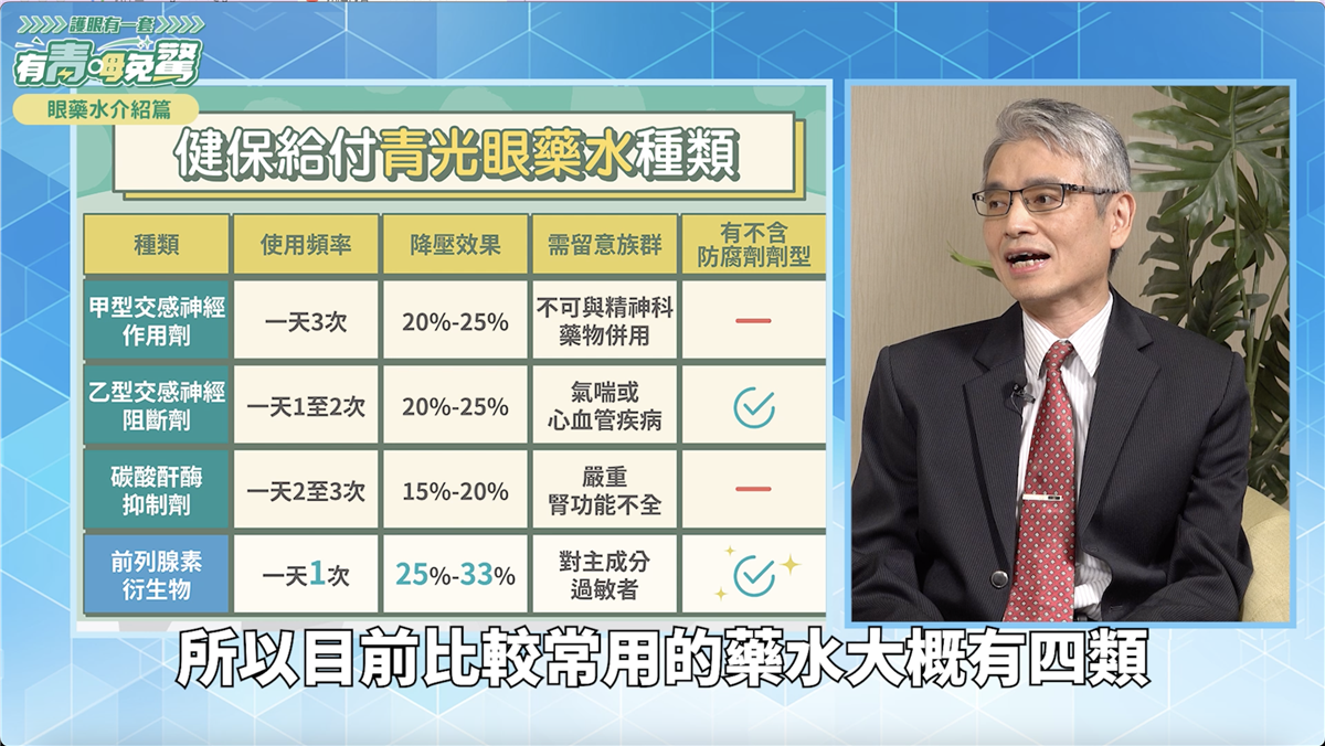 重點:依病患個別需求選擇能有效控制眼壓、點藥次數較少及副作用較低的眼藥水。